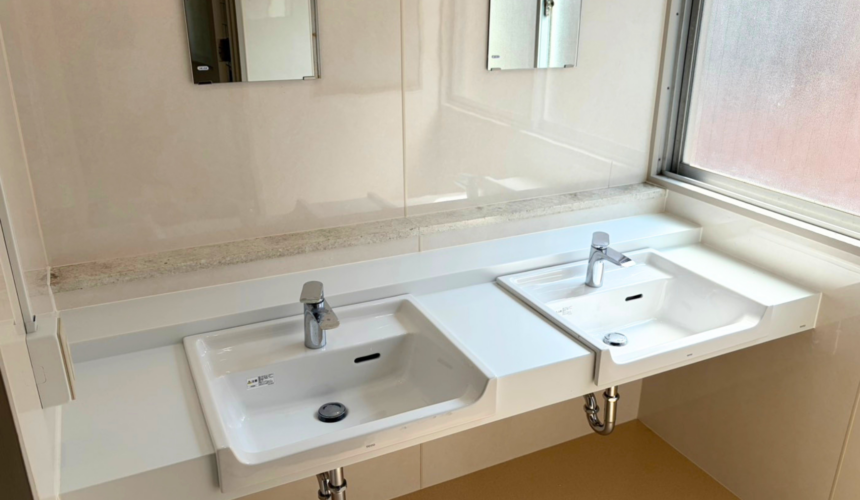 単身者向け社員寮の修繕工事の中から、今回は洗面・トイレの改修をご紹介します。